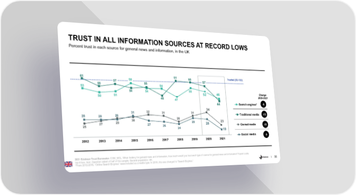 TRUST IN ALL INFORMATION SOURCES AT RECORD LOWS Percent trust in each source for general news and information, in the UK 61 58 61 60 Trusted (60-100) 55 57 55 57 53 54 54 54 55 52 46 Change 50 51 48 2020-2021 47 44 Search engines* -6 31 32 31 31 34 28 28 28 Traditional media -13 30 26 23 27 29 27 29 28 Owned media -11 25 26 24 19 Social media -9 2012 2013 2014 2015 2016 2017 2018 2019 2020 2021 2021 Edelman Trust Barometer. COM_MCL. When looking for general news and information, how much would you trust each type of source for general news and information? 9-point scale; top 4 box, trust. Question asked of half of the sample. General population, UK. *From 2012-2015, “Online Search Engines” were included as a media type. In 2016, this was changed to “Search Engines.” 35