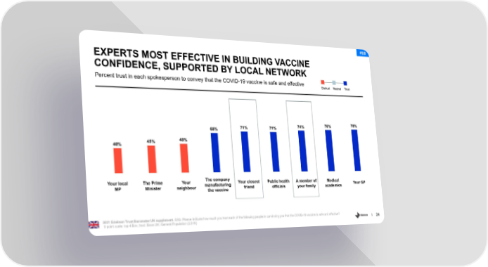 FEB EXPERTS MOST EFFECTIVE IN BUILDING VACCINE CONFIDENCE, SUPPORTED BY LOCAL NETWORK Percent trust in each spokesperson to convey that the COVID-19 vaccine is safe and effective Distrust Neutral Trust 71% 71% 74% 76% 78% 68% 45% 48% 40% Your local The Prime Your The company Your closest Public health A member of Medical MP Minister neighbour manufacturing friend officials your family academics Your GP the vaccine 2021 Edelman Trust Barometer UK supplement. QX2: Please indicate how much you trust each of the following people in convincing you that the COVID-19 vaccine is safe and effective? 9 point scale; top 4 Box, trust. Base UK: General Population (2,019) 24