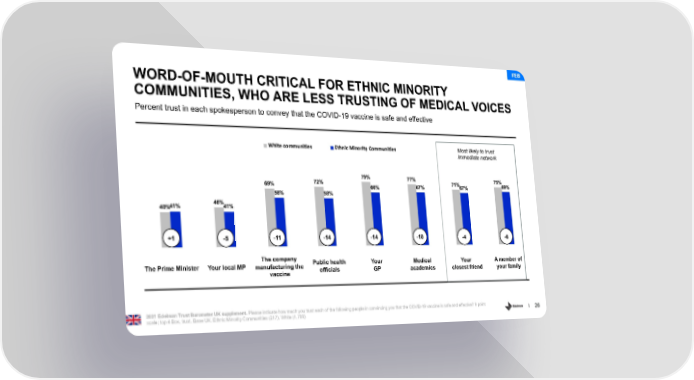FEB WORD-OF-MOUTH CRITICAL FOR ETHNIC MINORITY COMMUNITIES, WHO ARE LESS TRUSTING OF MEDICAL VOICES Percent trust in each spokesperson to convey that the COVID-19 vaccine is safe and effective White communities Ethnic Minority Communities Most likely to trust immediate network 72% 79% 77% 75% 69% 71% 69% 66% 67% 67% 58% 58% 46% 41% 41% 40% +1 -5 -11 -14 -14 -10 -4 -6 The company Public health Your Medical Your A member of The Prime Minister Your local MP manufacturing the officials GP academics closest friend your family vaccine 2021 Edelman Trust Barometer UK supplement. Please indicate how much you trust each of the following people in convincing you that the COVID-19 vaccine is safe and effective? 9 point scale; top 4 Box, trust. Base UK. Ethnic Minority Communities (217), White (1,799) 26