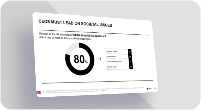 CEOS MUST LEAD ON SOCIETAL ISSUES Percent in the UK who expect CEOs to publicly speak out about one or more of these societal challenges Pandemic impact 58 Job automation 39 80% Local community issues 34 Societal issues 34 2021 Edelman Trust Barometer. CEO_SPEAK. Looking at the topics listed below, please select the ones you expect CEOs to currently be speaking out about publicly. Select all that apply. Question asked of half of the sample. General population, UK. CEO expectation to speak out is a net of attributes 1, 2, 5 and 7. 42