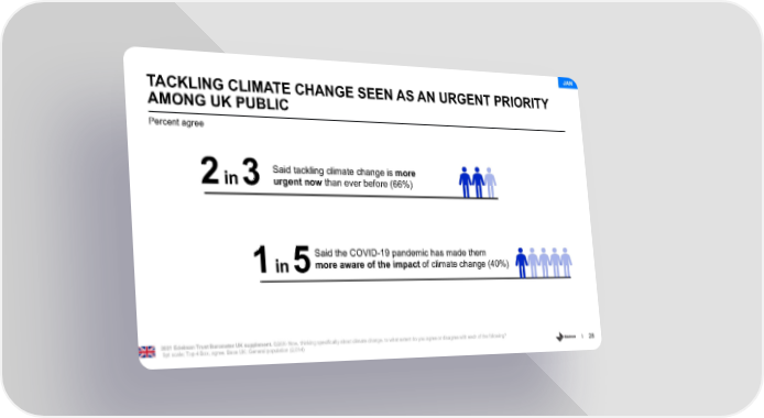 JAN TACKLING CLIMATE CHANGE SEEN AS AN URGENT PRIORITY AMONG UK PUBLIC Percent agree Said tackling climate change is more 2in 3 urgent now than ever before (66%) Said the COVID-19 pandemic has made them 1in 5more aware of the impact of climate change (40%) 2021 Edelman Trust Barometer UK supplement. Q26X- Now, thinking specifically about climate change, to what extent do you agree or disagree with each of the following? 9pt scale; Top 4 Box, agree. Base UK: General population (2,014) 28