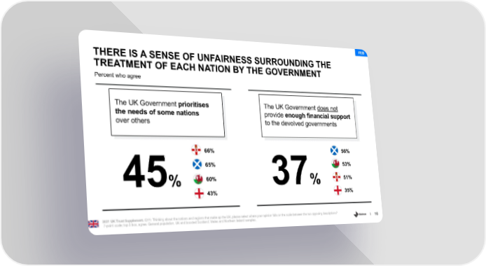 FEB THERE IS A SENSE OF UNFAIRNESS SURROUNDING THE TREATMENT OF EACH NATION BY THE GOVERNMENT Percent who agree The UK Government prioritises The UK Government does not the needs of some nations provide enough financial support over others to the devolved governments 66% 56% 65% 53% 45% 60% 37% 51% 43% 35% 2021 UK Trust Supplement. QY1: Thinking about the nations and regions that make up the UK, please select where your opinion falls on the scale between the two opposing descriptions? 7-point scale; top 3 box, agree. General population, UK and boosted Scotland, Wales and Northern Ireland samples. 16