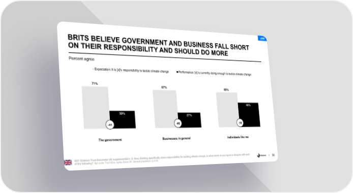 JAN BRITS BELIEVE GOVERNMENT AND BUSINESS FALL SHORT ON THEIR RESPONSIBILITY AND SHOULD DO MORE Percent agree Expectation: It is [x]'s responsibility to tackle climate change Performance: [x] is currently doing enough to tackle climate change 71% 67% 65% 46% 30% 27% -41 -40 -19 The government Businesses in general Individuals like me 2021 Edelman Trust Barometer UK supplementQ27r: X- Now, thinking specifically about responsibility for tackling climate change, to what extent do you agree or disagree with each of the following? 9pt scale; Top 4 Box, agree. Base UK: General population (2,014) 30