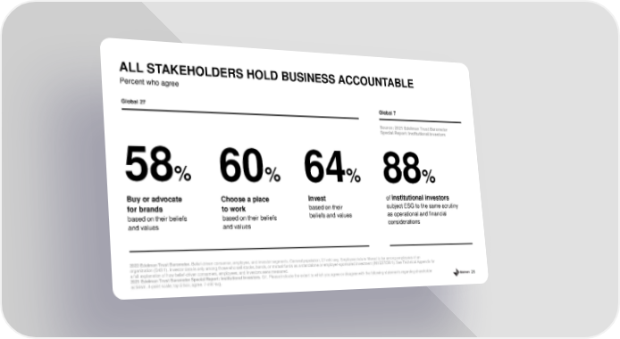 26 Percent who agree ALL STAKEHOLDERS HOLD BUSINESS ACCOUNTABLE 2022 Edelman Trust Barometer. Belief - driven consumer, employee, and investor segments. General population, 27 - mkt avg. Employee data is filtered to be among e mployees of an organization (Q43/1). Investor data is only among those who sell stocks, bonds, or mutual funds as a standalone or employer - spon sored investment (INVESTOR/1). See Technical Appendix for a full explanation of how belief - driven consumers, employees, and investors were measured. 2021 Edelman Trust Barometer Special Report: Institutional Investors. Q7. Please indicate the extent to which you agree or disagree with the following statements regarding shareholder activism. 4 - point scale; top 2 box, agree. 7 - mkt avg. Buy or advocate for brands based on their beliefs and values 58 % Choose a place to work based on their beliefs and values 60 % Invest based on their beliefs and values 64 % Source: 2021 Edelman Trust Barometer Special Report: Institutional Investors 88 % of institutional investors subject ESG to the same scrutiny as operational and financial considerations Global 7 Global 27