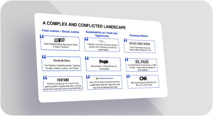 “ “ The Right to Food Movement: Fighting Hunger is About Justice, not Charity “ Does Regenerative Agriculture Have a Race Problem? “ A COMPLEX AND CONFLICTED LANDSCAPE Food Justice = Social Justice Sustainability as Threat and Opportunity How China plans to lead the world in sustainable food with latest five - year agricultural development plan “ Fertilizer prices just hit a record high sparking fears of global starvation and the worst food insecurity level since World War II “ War Has Brought the World to the Brink of a Food Crisis “ PepsiCo more than doubles revenue growth with framework prioritizing sustainability Almond Milk is Killing Billions of Honeybees Runaway Inflation Food Prices Keep Going Up, Here’s What it Means for You “ “ Los alimentos se encarecieron un 28% en 2021, hasta máximos desde los años setenta