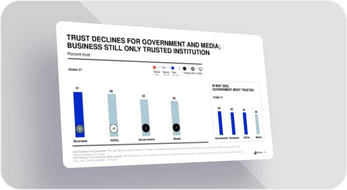 5 61 59 52 50 Business NGOs Government Media Percent trust TRUST DECLINES FOR GOVERNMENT AND MEDIA; BUSINESS STILL ONLY TRUSTED INSTITUTION 2022 Edelman Trust Barometer. TRU_INS. Below is a list of institutions. For each one, please indicate how much you trust that institution to do what is right. 9 - point scale; top 4 box , trust. General population, 27 - mkt avg. 2020 Edelman Trust Barometer Spring Update. TRU_INS. Below is a list of institutions. For each one, please indicate how much you trust that institution to do what is rig ht. 9 - point scale; top 4 box, trust. General population, 11 - mkt avg. Change, 2021 to 2022 - 0 + 0 +2 - 1 - 1 65 62 62 56 Government Business NGOs Media IN MAY 2020, GOVERNMENT MOST TRUSTED Global 11 Distrust (1 - 49) Neutral (50 - 59) Trust (60 - 100) Global 27