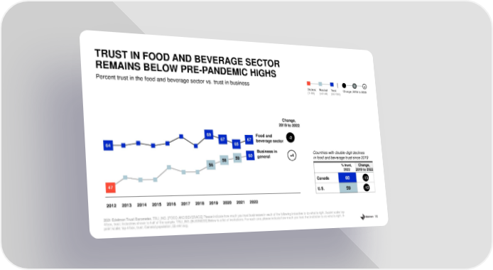 16 Percent trust in the food and beverage sector vs. trust in business TRUST IN FOOD AND BEVERAGE SECTOR REMAINS BELOW PRE - PANDEMIC HIGHS 2021 Edelman Trust Barometer. TRU_IND. [FOOD AND BEVERAGE] Please indicate how much you trust businesses in each of the following industries to do what is rig ht. 9 - point scale; top 4 box, trust. Industries shown to half of the sample. TRU_INS. [BUSINESS] Below is a list of institutions. For each one, please indicate how much you trust that institution to do wha t is right. 9 - point scale; top 4 box, trust. General population, 22 - mkt avg. 64 69 67 65 67 47 56 58 59 60 2012 2013 2014 2015 2016 2017 2018 2019 2020 2021 2022 Distrust (1 - 49) Neutral (50 - 59) Trust (60 - 100) Food and beverage sector Business in general - 2 +4 Change, 2019 to 2022 % trust, 2022 Change, 2019 to 2022 Canada 60 U.S. 59 - 13 - 12 Countries with double - digit declines in food and beverage trust since 2019 Change, 2019 to 2022 - 0 +