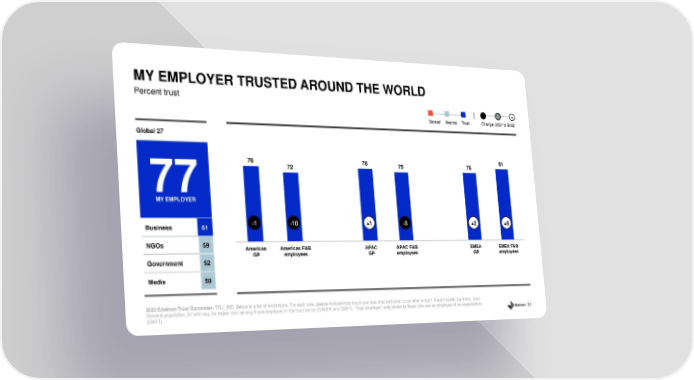 31 Percent trust MY EMPLOYER TRUSTED AROUND THE WORLD 2022 Edelman Trust Barometer. TRU_INS. Below is a list of institutions. For each one, please indicate how much you trust that institution to do what is rig ht . 9 - point scale; top 4 box, trust. General population, 27 - mkt avg, by region and among those employed in the food sector (Q420/8 and Q43/1). “Your employer” only shown to those who are an employee of an organization (Q43/1). Distrust Neutral Trust Change, 2021 to 2022 - 0 + 78 72 78 75 76 81 Americas GP Americas F&B employees APAC GP APAC F&B employees EMEA GP EMEA F&B employees 76 % Global 27 My employer more trusted than institutions Business 61 NGOs 59 Government 52 Media 50 77 MY EMPLOYER - 1 - 10 +1 - 3 +2 +8