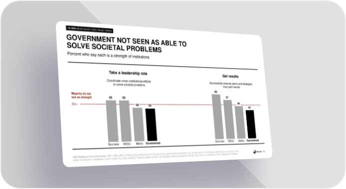 9 55 65 55 57 45 48 44 42 Percent who say each is a strength of institutions GOVERNMENT NOT SEEN AS ABLE TO SOLVE SOCIETAL PROBLEMS 2022 Edelman Trust Barometer. CMP_ARE_[INS]. Thinking about [institution] as they are today, please indicate whether you consider each of the following dim ens ions to be one of their areas of strength or weakness. 5 - point scale; top 2 box, strength. Question asked of half of the sample. General population, 24 - mkt avg. Data not collected in China, Russia and Thailand. Business NGOs Media Government 50 % Majority do not see as strength Business NGOs Media Government Take a leadership role Coordinate cross - institutional efforts to solve societal problems Get results Successfully execute plans and strategies that yield results GLOBAL 24 Not asked in China, Russia, Thailand