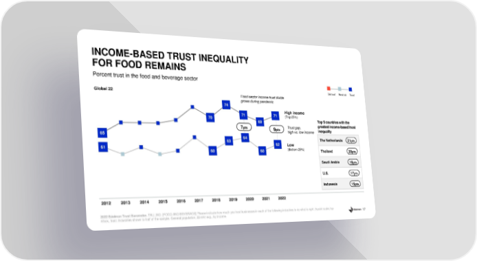 17 Percent trust in the food and beverage sector INCOME - BASED TRUST INEQUALITY FOR FOOD REMAINS 2022 Edelman Trust Barometer. TRU_IND. [FOOD AND BEVERAGE] Please indicate how much you trust businesses in each of the following industries to do what is rig ht. 9 - point scale; top 4 box, trust. Industries shown to half of the sample. General population, 22 - mkt avg., by income. Distrust Neutral Trust High income (Top 25%) Low (Bottom 25%) Trust gap, high vs. low income Top 5 countries with the greatest income - based trust inequality The Netherlands Thailand Saudi Arabia U.S. Indonesia 20 pts 18 pts 17 pts 15 pts 21 pts Global 22 9 pts 7 pts Food sector income trust divide grows during pandemic 65 70 74 71 69 71 61 60 63 64 60 62 2012 2013 2014 2015 2016 2017 2018 2019 2020 2021 2022