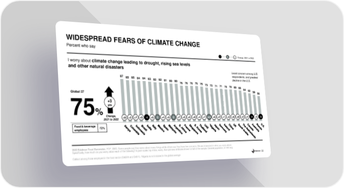 22 Percent who say WIDESPREAD FEARS OF CLIMATE CHANGE 2022 Edelman Trust Barometer. POP_EMO. Some people say they worry about many things while others say they have few concerns. We are interested in what you wo rry about. Specifically, how much do you worry about each of the following? 9 - point scale; top 4 box, worry. Non - job loss attributes shown to half of the sample. General population, 27 - mkt avg Callout among those employed in the food sector (Q420/8 and Q43/1). *Nigeria is not included in the global average 75 % Global 27 87 85 85 84 84 83 82 82 81 80 80 76 76 76 76 75 73 72 71 71 70 70 69 68 64 62 59 56 +9 +2 +7 +5 - 1 +5 0 +4 +5 0 +7 +3 +3 +8 +1 +7 n/a +6 +2 +1 +3 +6 +9 +2 +1 - 4 +3 - 5 I worry about climate change leading to drought, rising sea levels and other natural disasters +3 pts Change, 2021 to 2022 Change, 2021 to 2022 - 0 + Least concern among U.S. respondents, and greatest decline in the U.S. Food & beverage employees 72%