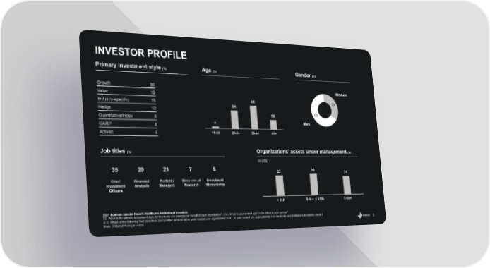 3 In USD Primary investment style (%) 4 34 44 18 18-24 25-34 35-44 45+ Age (%) Gender (%) Growth 36 Value 19 Industry - specific 15 Hedge 10 Quantitative/Index 8 GARP 4 Activist 4 J ob titles (%) 33 35 31 < $1b $1b – < $10b $10b+ Organizations’ assets u nder management (%) INVESTOR PROFILE 2021 Edelman Special Report: Healthcare Institutional Investors D2. What is the primary investment style for the funds you manage on behalf of your organization? // S1. What is your current ag e? // D4. What is your gender? S12. Which of the following best describes your position or level within your company or organization? // S7. In your current jo b, approximately how much are your institution's investable assets? Base: 3 - Market Average n=225 35 29 21 7 6 Chief Investment Officers Financial Analysts Portfolio Managers Directors of Research Investment Stewardship 35 65 Women Men