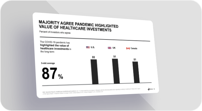 10 Percent of investors who agree MAJORITY AGREE PANDEMIC HIGHLIGHTED VALUE OF HEALTHCARE INVESTMENTS 2021 Special Report: Healthcare Institutional Investors: Q 7 : To what extent do you agree or disagree with the following statements regarding investing in healthcare? Shown NET Agree =T3B Agree Base: 3 - Market Global Average n=225 ; United States n=75, United Kingdom n=75, Canada n=75 88 91 81 U.S. UK Canada The COVID - 19 pandemic has highlighted the value of healthcare investments in the long - term 87 % 3 - mkt average