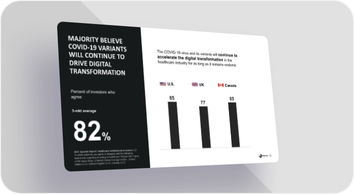 13 Percent of investors who agree MAJORITY BELIEVE COVID - 19 VARIANTS WILL CONTINUE TO DRIVE DIGITAL TRANSFORMATION 2021 Special Report: Healthcare Institutional Investors: Q 7 : To what extent do you agree or disagree with the following statements regarding investing in healthcare? Shown NET Agree =T3B Agree Base: 3 - Market Global Average n=225 ; ; United States n=75, United Kingdom n=75, Canada n=75 85 77 85 U.S. UK Canada The COVID - 19 virus and its variants will continue to accelerate the digital transformation in the healthcare industry for as long as it remains endemic 3 - mkt average 82 %