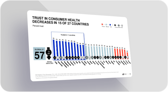 TRUST IN CONSUMER HEALTH DECREASES IN 15 OF 27 COUNTRIES - 0 + Distrust Neutral Trust Change, 2020 to 2021 Percent trust Trusted in 11 countries 78 74 73 73 72 70 69 68 62 60 60 57 55 55 55 55 54 54 52 50 50 50 46 46 44 44 42 GLOBAL 27 30 -3 pts 57 -6+1 0 +9 -3 -8 -12 -3 -2 +4 +8 0 +5 0 -5 -1 0 +3 -21 -4 n/a -4 -6 -14 -1 +1 -5 +3 Change, 2020 to 2021 2021 Edelman Trust Barometer.TRU_SUB_HEA.[CONSUMER HEALTH] Now thinking about specific sectors within the health industry, please indicate how much you trust businesses in each of the following sectors to do what is right. 9-point scale; top 4 box, trust. Question asked of one-fifth of the sample. General population, 27-mkt avg. *Nigeria is not included in the global average 36