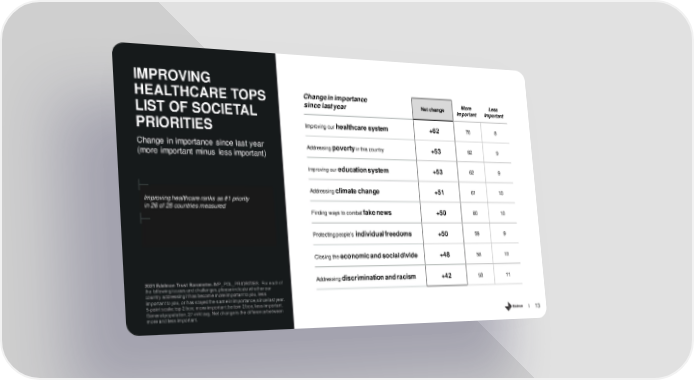 IMPROVING HEALTHCARE TOPS Change in importance More Less LIST OF SOCIETAL since last year Net change Important Important PRIORITIES Improving our healthcare system +62 70 8 Change in importance since last year Addressing povertyin this country +53 62 9 (more important minus less important) Improving our education system +53 62 9 Addressing climate change +51 61 10 Improving healthcare ranks as #1 priority in 26 of 28 countries measured Finding ways to combat fake news +50 60 10 Protecting people’s individual freedoms +50 59 9 Closing the economic and social divide +48 58 10 2021 Edelman Trust Barometer.IMP_POL_PRIORITIES. For each of Addressing discrimination and racism +42 53 11 the following issues and challenges, please indicate whether our country addressing it has become more important to you, less important to you, or has stayed the same in importance, since last year. 5-point scale; top 2 box; more important; bottom 2 box, less important. General population, 27-mkt avg. Net change is the difference between more and less important. 13