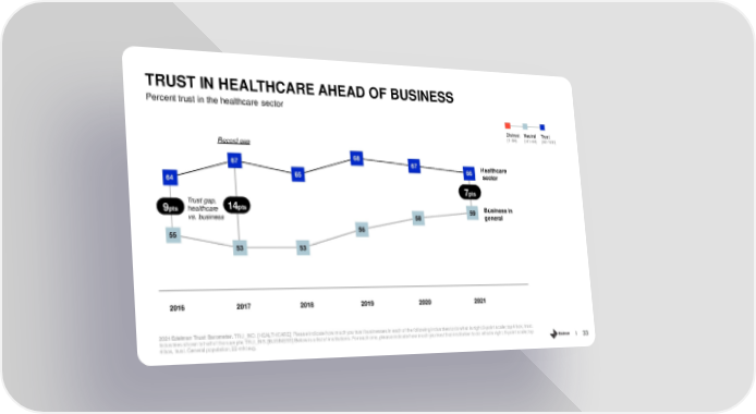 TRUST IN HEALTHCARE AHEAD OF BUSINESS Percent trust in the healthcare sector Distrust Neutral Trust (1-49) (50-59) (60-100) Record gap 67 68 67 66 Healthcare 65 sector 64 7pts Trust gap, 14pts Business in 9pts healthcare 59 general vs. business 58 55 56 53 53 2016 2017 2018 2019 2020 2021 2021 Edelman Trust Barometer. TRU_IND. [HEALTHCARE] Please indicate how much you trust businesses in each of the following industries to do what is right. 9-point scale; top 4 box, trust. Industries shown to half of the sample. TRU_INS. [BUSINESS] Below is a list of institutions. For each one, please indicate how much you trust that institution to do what is right. 9-point scale; top 4 box, trust. General population, 22-mkt avg. 33