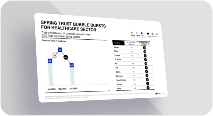 SPRING TRUST BUBBLE BURSTS FOR HEALTHCARE SECTOR - 0 + Distrust Neutral Trust Change, wave to wave Trust in healthcare, 11 countries included in the (1-49) (50-59) (60-100) 2020 Trust Barometer Spring Update Global 11, trust in healthcare Countries +/- Jan 2020 to +/- May 2020 to May 2020 Jan 2021 Mexico +6 -20 -17 76 China +8 -17 -15 Canada +14 -15 +8 -13 -11 S. Korea +2 -11 -12 68 UK +9 -10 65 -11 U.S. +18 -8 -10 Japan -5 -9 -6 Germany +14 -8 -5 Saudi Arabia +9 -1 -6 France +6 -5 -1 Jan 2020 May 2020 Jan 2021 India +5 -4 2 2021 Edelman Trust Barometer. TRU_IND. [HEALTHCARE] Please indicate how much you trust businesses in each of the following industries to do what is right. 9-point scale; top 4 box, trust. Industries shown to half of the sample. General population, 11-mkt avg. 9