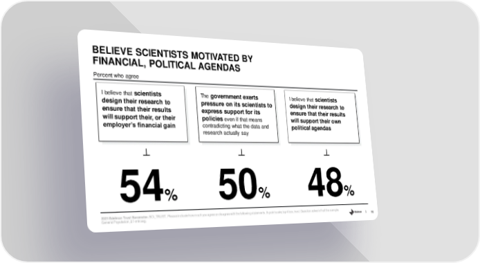 BELIEVE SCIENTISTS MOTIVATED BY FINANCIAL, POLITICAL AGENDAS Percent who agree I believe that scientists The government exerts I believe that scientists design their research to pressure on its scientists to design their research to ensure that their results express support for its ensure that their results will support their, or their policies even if that means will support their own contradicting what the data and employer’s financial gain political agendas research actually say 54% 50% 48% 2021 Edelman Trust Barometer.SCI_TRUST. Please indicate how much you agree or disagree with the following statements.9-point scale; top 4 box, trust. Question asked of half the sample. General Population, 27-mkt avg. 16