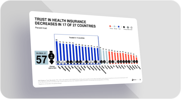 TRUST IN HEALTH INSURANCE DECREASES IN 17 OF 27 COUNTRIES - 0 + Distrust Neutral Trust Change, 2020 to 2021 Percent trust Trusted in 14 countries 83 76 75 74 74 73 68 68 66 65 64 64 61 61 58 53 51 49 48 45 44 43 43 40 GLOBAL 27 38 37 34 -3 26 pts 57 0+3+5-13 -4 0 -5 -10 +5 -4 +12 +4 -7 +9 -9 -12 +4 -18 -2 +4 -6 -10 -4 -2 -1 n/a -9 -3 Change, 2020 to 2021 2021 Edelman Trust Barometer.TRU_SUB_HEA.[HEALTH INSURANCE] Now thinking about specific sectors within the health industry, please indicate how much you trust businesses in each of the following sectors to do what is right. 9-point scale; top 4 box, trust. Question asked of one-fifth of the sample. General population, 27-mkt avg. *Nigeria is not included in the global average 38