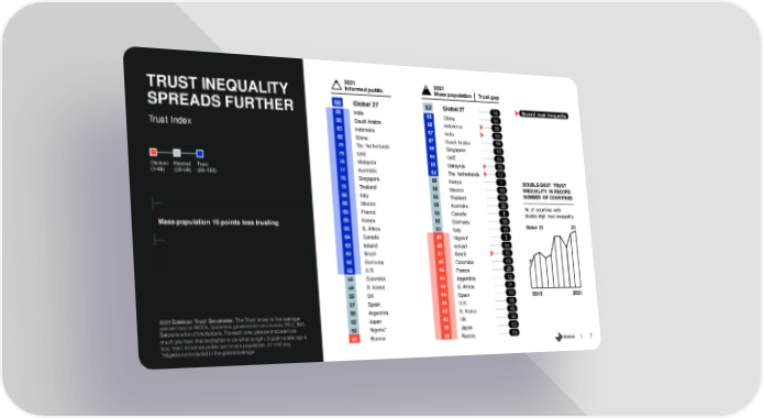 2021 2021 Trust gap TRUST INEQUALITY Informed public Mass population SPREADS FURTHER 68 Global 27 52 Global 27 16 Record trust inequality 86 India 68 China 14 Trust Index 86 Saudi Arabia 68 Indonesia 15 83 Indonesia 67 India 19 82 China 67 Saudi Arabia 19 79 The Netherlands 66 Singapore 10 79 UAE 65 UAE 14 78 Malaysia 63 Malaysia 15 Distrust Neutral Trust 77 Australia 62 The Netherlands 17 (1-49) (50-59) (60-100) 76 Singapore 58 Kenya 7 DOUBLE-DIGIT TRUST 75 Thailand 56 Mexico 10 INEQUALITY IN RECORD 66 Italy 56 Thailand 19 NUMBER OF COUNTRIES 66 Mexico 55 Australia 22 Nr. of countries with 65 France 55 Canada 9 double-digit trust inequality Mass population 16 points less trusting 65 Kenya 52 Germany 10 65 S. Africa 51 Italy 15 Global 22 21 64 Canada 49 Nigeria* 3 63 Ireland 48 Ireland 15 62 Brazil 47 Brazil 15 62 Germany 46 Colombia 13 7 62 U.S. 45 France 20 59 Colombia 44 Argentina 12 59 S. Korea 44 S. Africa 21 59 UK 44 Spain 13 2012 2021 57 Spain 44 U.S. 18 2021 Edelman Trust Barometer. The Trust Index is the average 56 Argentina 43 S. Korea 16 percent trust in NGOs, business, government and media. TRU_INS. 52 Japan 43 UK 16 Below is a list of institutions. For each one, please indicate how 52 Nigeria* 39 Japan 13 much you trust that institution to do what is right. 9-point scale; top 4 41 Russia 28 Russia 13 box, trust. Informed public and mass population, 27-mkt avg. *Nigeria not included in the global average 7