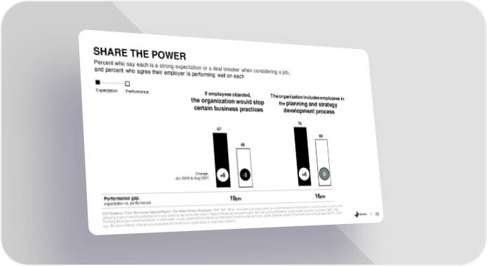 SHARE THE POWER Percent who say each is a strong expectation or a deal breaker when considering a job, and percent who agree their employer is performing well on each Expectation Performance If employees objected, The organization includes employees in the organization would stop the planning and strategy certain business practices development process 76 67 60 48 Change, +6 -3 +6 0 Jan 2019 to Aug 2021 Performance gap, 19pts 16pts expectation vs. performance 2021 Edelman Trust Barometer Special Report: The Belief-Driven Employee. EMP_IMP. When considering an organization as a potential place of employment, how important is each of the following to you in deciding whether or not you would accept a job offer there? Please indicate your answer to each item using the scale below. 3-point scale; top 2 box, important. EMP_VAL. Thinking about your current employer, to what extent do you agree with the following statements? 9-point scale; top 4 box, agree. Question asked of those who are an employee (Q43/1). 7-mkt avg. All data is filtered to be among employees who work for an organization or corporation (Q43/1). 28