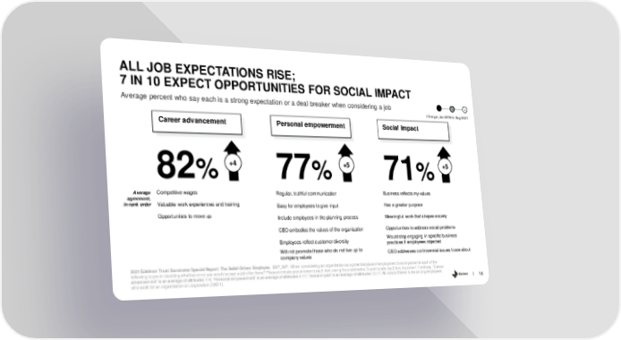 ALL JOB EXPECTATIONS RISE; 7 IN 10 EXPECT OPPORTUNITIES FOR SOCIAL IMPACT Average percent who say each is a strong expectation or a deal breaker when considering a job - 0 + Change, Jan 2019 to Aug 2021 Career advancement Personal empowerment Social impact 82% +4 77% +5 71% +5 Average Competitive wages Regular, truthful communication Business reflects my values agreement, in rank order Valuable work experiences and training Easy for employees to give input Has a greater purpose Opportunities to move up Include employees in the planning process Meaningful work that shapes society CEO embodies the values of the organization Opportunities to address social problems Employees reflect customer diversity Would stop engaging in specific business practices if employees objected Will not promote those who do not live up to CEO addresses controversial issues I care about company values 2021 Edelman Trust Barometer Special Report: The Belief-Driven Employee. EMP_IMP. When considering an organization as a potential place of employment, how important is each of the following to you in deciding whether or not you would accept a job offer there? Please indicate your answer to each item using the scale below. 3-point scale; top 2 box, important.7-mkt avg. “Career advancement” is an average of attributes 1-4; “Personal empowerment” is an average of attributes 5-11; “Social impact” is an average of attributes 12-17. All data is filtered to be among employees who work for an organization or corporation (Q43/1). 14