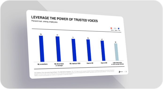 LEVERAGE THE POWER OF TRUSTED VOICES Percent trust, among employees Distrust Neutral Trust 78 77 71 70 67 59 My co-workers My direct boss My employer CEO Head of HR Head of DEI Labor/trade union or manager or work counsel officials 2021 Edelman Trust Barometer Special Report: The Belief-Driven Employee. TRU_PEP. Below is a list of groups of people. For each one, please indicate how much you trust that group of people to do what is right. 9-point scale; top 4 box, trust. All attributes asked among those who are employed (Q43/1) except “Labor/trade union or work counsel officials”. 7-mkt avg. All data is filtered to be among employees who work for an organization or corporation (Q43/1). 31