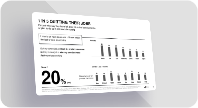 1 IN 5 QUITTING THEIR JOBS Percent who say they have left their job in the last six months, or plan to do so in the next six months I plan to or have done one of these within the last or next six months Markets 28 25 24 20 16 Quit my current job and look for or start a new one 15 11 Quit my current job to start my own business Retireand stop working India UK U.S. Germany China Brazil Japan Global 7 Gender | Age | Income 20 25 25 20 19 17 19 18 Highest turnover for younger, low income 20%(net) Men Women 18-34 35-54 55+ Low Middle High 2021 Edelman Trust Barometer Special Report: The Belief-Driven Employee. JOB_ATT. Which of the following best describes your job situation? 7-mkt avg., and by demographics. All data is filtered to be among employees who work for an organization or corporation (Q43/1). “I plan to or have done one of these within the last or next six months” is a net of attributes 2, 3, 4, and 6. 10