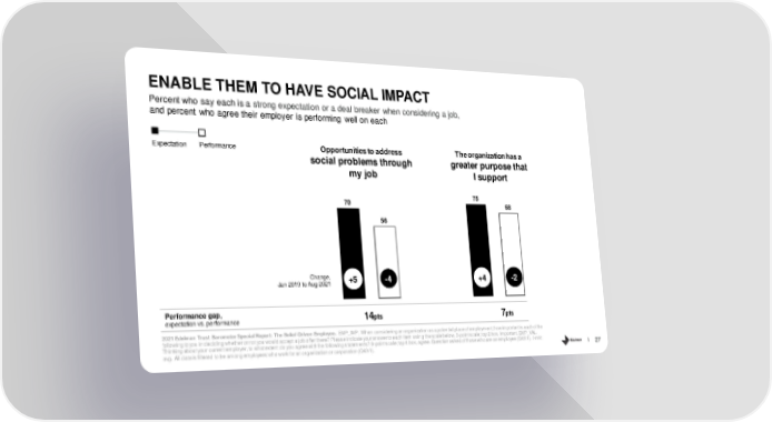 ENABLE THEM TO HAVE SOCIAL IMPACT Percent who say each is a strong expectation or a deal breaker when considering a job, and percent who agree their employer is performing well on each Expectation Performance Opportunities to address The organization has a social problems through greater purpose that my job I support 70 75 68 56 Change, +5 -4 +4 -2 Jan 2019 to Aug 2021 Performance gap, 14pts 7pts expectation vs. performance 2021 Edelman Trust Barometer Special Report: The Belief-Driven Employee. EMP_IMP. When considering an organization as a potential place of employment, how important is each of the following to you in deciding whether or not you would accept a job offer there? Please indicate your answer to each item using the scale below. 3-point scale; top 2 box, important. EMP_VAL. Thinking about your current employer, to what extent do you agree with the following statements? 9-point scale; top 4 box, agree. Question asked of those who are an employee (Q43/1). 7-mkt avg. All data is filtered to be among employees who work for an organization or corporation (Q43/1). 27