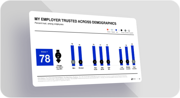 MY EMPLOYER TRUSTED ACROSS DEMOGRAPHICS Percent trust, among employees - 0 + Distrust Neutral Trust Change, Jan 2020 to Aug 2021 79 78 78 78 84 76 77 68 Global 7 -- 1 78 pt 0 -3 -3 -1 -1 -6 -1 0 Change, Jan 2020 to Men Women Age Age Age Low Middle High Aug 2021 18-34 35-54 55+ income income income 2021 Edelman Trust Barometer Special Report: The Belief-Driven Employee. TRU_INS. [YOUR EMPLOYER] Below is a list of institutions. For each one, please indicate how much you trust that institution to do what is right. 9-point scale; top 4 box, trust. “Your employer” asked among those who are employed (Q43/1).7-mkt avg., and by demographics. All data is filtered to be among employees who work for an organization or corporation (Q43/1). 38