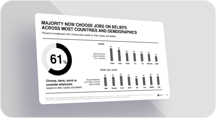 MAJORITY NOW CHOOSE JOBS ON BELIEFS ACROSS MOST COUNTRIES AND DEMOGRAPHICS Percent of employees who choose jobs based on their values and beliefs Markets 87 79 58 58 55 54 Majority choose 39 jobs on beliefs in 61% 6 of 7 countries China India Brazil U.S. UK Germany Japan Gender | Age | Income 59 61 67 61 57 62 62 49 Choose, leave, avoid or Young employees consider employers most likely to choose jobs on beliefs based on their values and beliefs Men Women 18-34 35-54 55+ Low Middle High 2021 Edelman Trust Barometer Special Report: The Belief-Driven Employee. Belief-driven employee segments. 7-mkt avg., and by demographics. All data is filtered to be among employees who work for an organization or corporation (Q43/1). See Technical Appendix for a full explanation of how belief-driven employees were measured. 16