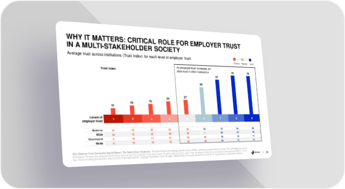 WHY IT MATTERS: CRITICAL ROLE FOR EMPLOYER TRUST IN A MULTI-STAKEHOLDER SOCIETY Average trust across institutions (Trust Index) for each level of employer trust Distrust Neutral Trust As employer trust increases, so Trust Index does trust in other institutions 76 76 67 52 24 27 16 19 11 Levels of 1 2 3 4 5 6 7 8 9 employer trust Business 12 18 20 24 30 63 76 85 86 NGOs 18 19 22 26 29 53 67 77 76 Government 4 12 17 21 23 48 65 72 71 Media 11 15 16 25 25 44 61 71 71 2021 Edelman Trust Barometer Special Report: The Belief-Driven Employee. The Trust Index is the average percent trust in NGOs, business, government and media. TRU_INS. Below is a list of institutions. For each one, please indicate how much you trust that institution to do what is right. 9-point scale; top 4 box, trust. “Your employer” asked among those who are employed (Q43/1).7-mkt avg. Data is showing the top 4 box trust score (6-9) for each level of “employer” trust from 1 to 9. All data is filtered to be among employees who work for an organization or corporation (Q43/1). 34