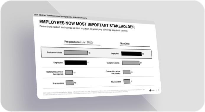 2021 Edelman Trust Barometer Spring Update: A World in Trauma EMPLOYEES NOW MOST IMPORTANT STAKEHOLDER Percent who ranked each group as most important to a company achieving long-term success Pre-pandemic (Jan 2020) May 2021 Customers/clients 40 Employees 40 Employees 37 Customers/clients 34 Communities where 12 Communities where 14 they operate they operate Shareholders 12 Shareholders 12 2021 Edelman Trust Barometer Spring Update: A World in Trauma. PPL_RNK. Please rank the following four groups of people in terms of their importance to a company achieving long-term success. Give the most important group a rank of 1 and the least important a rank of 4. Question asked of half of the sample. General population, 14-mkt avg. 3
