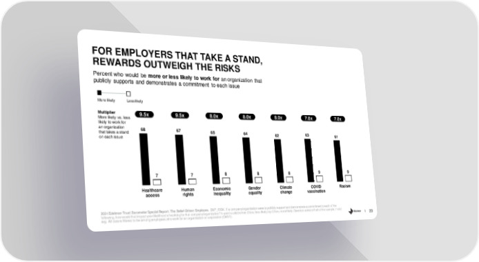 FOR EMPLOYERS THAT TAKE A STAND, REWARDS OUTWEIGH THE RISKS Percent who would be more or less likely to work for an organization that publicly supports and demonstrates a commitment to each issue More likely Less likely Multiplier 9.5x 9.5x 8.0x 8.0x 8.0x 7.0x 7.0x More likely vs. less likely to work for an organization 68 67 65 that takes a stand 64 62 63 61 on each issue 7 7 8 8 8 9 9 Healthcare Human Economic Gender Climate COVID Racism access rights inequality equality change vaccination 2021 Edelman Trust Barometer Special Report: The Belief-Driven Employee. EMP_RISK. If a company/organization were to publicly support and demonstrate a commitment to each of the following, how would that impact your likelihood of working for that company/organization? 5-point scale; bottom 2 box, less likely; top 2 box, more likely. Question asked of half of the sample. 7-mkt avg. All data is filtered to be among employees who work for an organization or corporation (Q43/1). 20
