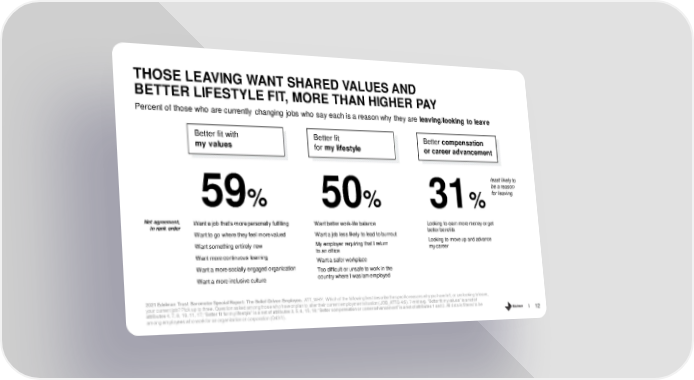 THOSE LEAVING WANT SHARED VALUES AND BETTER LIFESTYLE FIT, MORE THAN HIGHER PAY Percent of those who are currently changing jobs who say each is a reason why they are leaving/looking to leave Better fit with Better fit Better compensation my values for my lifestyle or career advancement least likely to be a reason 59% 50% 31%for leaving Net agreement, Want a job that’s more personally fulfilling Want better work-life balance Looking to earn more money or get in rank order better benefits Want to go where they feel more valued Want a job less likely to lead to burnout Looking to move up and advance Want something entirely new My employer requiring that I return my career Want more continuous learning to an office Want a safer workplace Want a more socially engaged organization Too difficult or unsafe to work in the Want a more inclusive culture country where I was/am employed 2021 Edelman Trust Barometer Special Report: The Belief-Driven Employee. ATT_WHY. Which of the following best describe the specific reasons why you have left, or are looking to leave, your current job? Pick up to three. Question asked among those who have or plan to alter their current employment situation (JOB_ATT/2-4;6). 7-mkt avg. “Better fit my values” is a net of attributes 4, 7, 8, 10, 11, 17; “Better fit for my lifestyle” is a net of attributes 3, 5, 6, 15, 18; “Better compensation or career advancement” is a net of attributes 1 and 2. All data is filtered to be among employees who work for an organization or corporation (Q43/1). 12