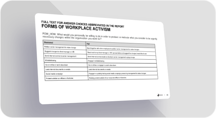 FULL TEXT FOR ANSWER CHOICES ABBREVIATED IN THE REPORT FORMS OF WORKPLACE ACTIVISM POW_HOW. What would you personally be willing to do in order to produce or motivate what you consider to be urgently necessary changes within the organization you work for? Shortened Full Petition senior management to make change Band together with other employees to petition senior management to make changes Suggest changes to direct manager or HR Reach out to my direct manager or HR representative and suggest the changes I would like to see Send internal comms to senior management Send internal communications directly to senior management urging change Whistleblowing Engage in whistleblowing Go on strike or work slow-down Go on strike or engage in a work slow-down Leak internal documents or emails Leak internal documents or emails Social media campaign Engage in a publicly-facing social media campaign pressuring management to make changes Protest outside our offices or factories Publicly protest outside of our corporate offices or factories 48
