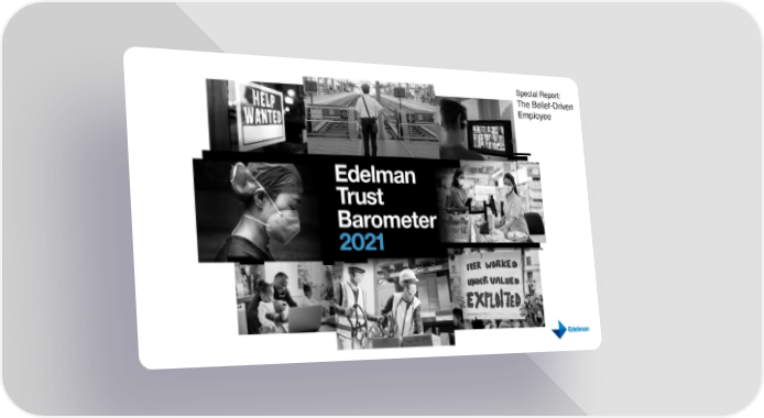 FOR EMPLOYERS THAT TAKE A STAND, REWARDS OUTWEIGH THE RISKS Percent who would be more or less likely to work for an organization that publicly supports and demonstrates a commitment to each issue More likely Less likely Multiplier 9.5x 9.5x 8.0x 8.0x 8.0x 7.0x 7.0x More likely vs. less likely to work for an organization 68 67 65 that takes a stand 64 62 63 61 on each issue 7 7 8 8 8 9 9 Healthcare Human Economic Gender Climate COVID Racism access rights inequality equality change vaccination 2021 Edelman Trust Barometer Special Report: The Belief-Driven Employee. EMP_RISK. If a company/organization were to publicly support and demonstrate a commitment to each of the following, how would that impact your likelihood of working for that company/organization? 5-point scale; bottom 2 box, less likely; top 2 box, more likely. Question asked of half of the sample. 7-mkt avg. All data is filtered to be among employees who work for an organization or corporation (Q43/1). 20