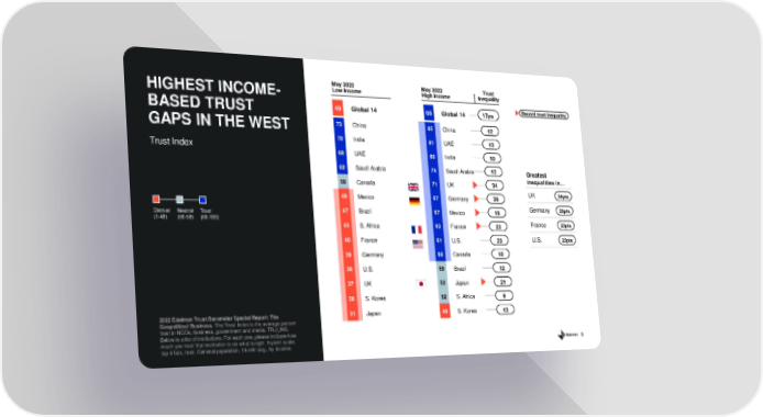 8 HIGHEST INCOME - BASED TRUST GAPS IN THE WEST 2022 Edelman Trust Barometer Special Report: The Geopolitical Business. The Trust Index is the average percent trust in NGOs, business, government and media. TRU_INS. Below is a list of institutions. For each one, please indicate how much you trust that institution to do what is right. 9 - point scale; top 4 box, trust. General population, 14 - mkt avg., by income. Trust inequality May 2022 Low income May 2022 High income 66 Global 14 85 China 81 UAE 80 India 74 Saudi Arabia 71 UK 67 Germany 67 Mexico 63 France 61 U.S. 60 Canada 59 Brazil 52 Japan 52 S. Africa 49 S. Korea 12 13 10 12 34 28 18 23 10 21 9 13 12 23 49 Global 14 73 China 70 India 68 UAE 62 Saudi Arabia 50 Canada 49 Mexico 47 Brazil 43 S. Africa 40 France 39 Germany 38 U.S. 37 UK 36 S. Korea 31 Japan 17 pts s Greatest inequalities in... UK Germany France U.S. 34 pts 28pts 23pts 23 pts Trust Index Distrust (1 - 49) Neutral (50 - 59) Trust (60 - 100) Record trust inequality