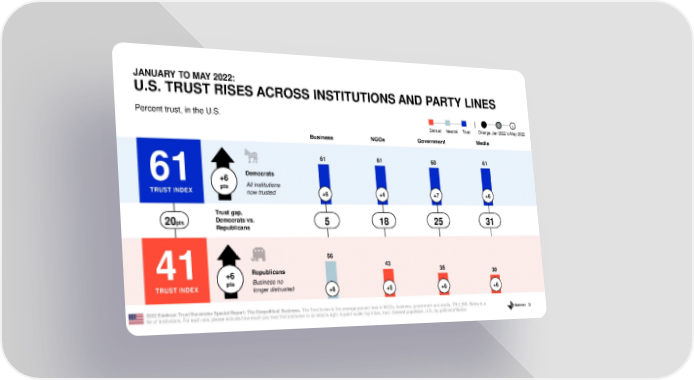 9 Percent trust, in the U.S. JANUARY TO MAY 2022: U.S. TRUST RISES ACROSS INSTITUTIONS AND PARTY LINES 2022 Edelman Trust Barometer Special Report: The Geopolitical Business. The Trust Index is the average percent trust in NGOs, business, government and media. TRU_INS. Below is a list of institutions. For each one, please indicate how much you trust that institution to do what is right. 9 - point scale; top 4 box, trust. General population, U.S., by political affiliation. 56 43 35 30 61 61 60 61 Distrust Neutral Trust Change, Jan 2022 to May 2022 - 0 + 41 TRUST INDEX Democrats Republicans Trust gap, Democrats vs. Republicans 61 TRUST INDEX +6 +4 +7 +6 +6 pts +6 pts Business NGOs Government Media 18 20 pts 5 25 31 Business no longer distrusted +8 +5 +6 +6 All institutions now trusted