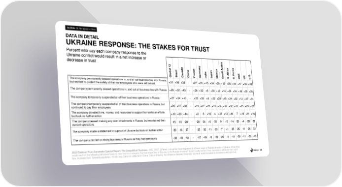 38 Percent who say each company response to the Ukraine conflict would result in a net increase or decrease in trust DATA IN DETAIL UKRAINE RESPONSE: THE STAKES FOR TRUST 2022 Edelman Trust Barometer Special Report: The Geopolitical Business. UKE_TRST. Different companies have responded in different ways to Russia's invasion of Ukraine. What effect would each of the following behaviors have on your trust in a company that has responded in this way to the Russian invasion? 6 - point scale; bottom 3 box, decrease or eliminate trust; top 2 box, increase trust. General population, 13 - mkt avg. Data not collected in China. Dat a is showing the difference between those who say each would increase vs decrease or eliminate trust. Global 13 Brazil Canada China France Germany India Japan Mexico Saudi Arabia S. Africa S. Korea UAE UK U.S. The company permanently ceased operations in, and all cut business ties with Russia; but worked to protect the safety of their ex - employees who were left behind +31 +36 +38 - +27 +33 +15 +34 +29 +19 +35 +44 +17 +38 +39 The company permanently ceased operations in, and cut all business ties with Russia +28 +32 +43 - +26 +32 +6 +30 +19 +16 +28 +34 +16 +39 +39 The company temporarily suspended all of their business operations in Russia +27 +34 +40 - +25 +30 +8 +32 +22 +15 +24 +32 +13 +37 +34 The company temporarily suspended all of their business operations in Russia, but continued to pay their employees +26 +37 +30 - +19 +27 +23 +13 +36 +16 +32 +31 +25 +25 +27 The company donated time, money, and resources to support humanitarian efforts but took no further action +10 +20 +14 - +2 - 5 +15 - 4 +28 +12 +14 - 7 +13 +11 +16 The company ceased making any new investments in Russia, but maintained their current operations - 15 - 13 - 28 - - 20 - 34 +6 - 33 0 +5 - 14 - 20 +4 - 28 - 23 The company made a statement in support of Ukraine but took no further action - 20 - 16 - 27 - - 25 - 32 - 11 - 33 - 7 +1 - 25 - 25 - 11 - 26 - 21 The company carried on doing business in Russia as they had previously - 38 - 49 - 51 - - 47 - 49 - 5 - 59 - 25 - 5 - 41 - 50 - 11 - 50 - 45 GLOBAL 13 Not asked in China