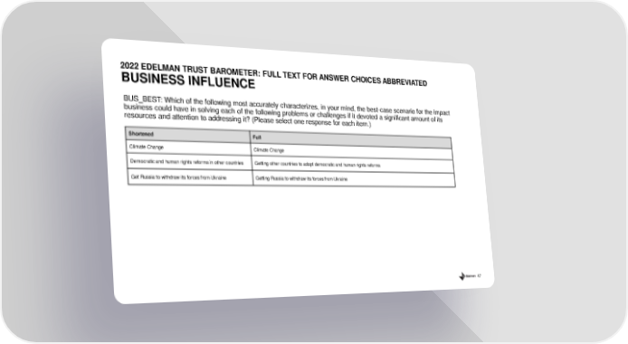 47 2022 EDELMAN TRUST BAROMETER: FULL TEXT FOR ANSWER CHOICES ABBREVIATED BUSINESS INFLUENCE Shortened Full Climate Change Climate Change Democratic and human rights reforms in other countries Getting other countries to adopt democratic and human rights reforms Get Russia to withdraw its forces from Ukraine Getting Russia to withdraw its forces from Ukraine BUS_BEST: Which of the following most accurately characterizes, in your mind, the best - case scenario for the impact business could have in solving each of the following problems or challenges if it devoted a significant amount of its resources and attention to addressing it? (Please select one response for each item.)
