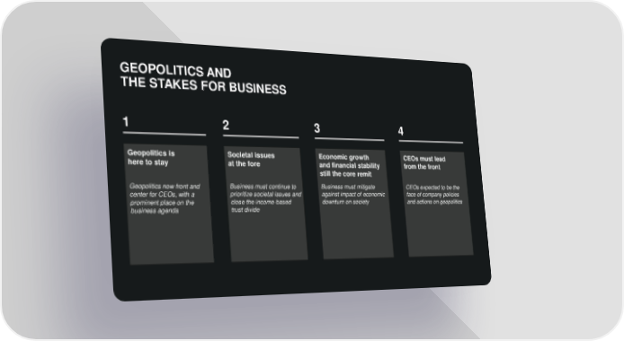 3 4 2 1 GEOPOLITICS AND THE STAKES FOR BUSINESS Geopolitics is here to stay Geopolitics now front and center for CEOs, with a prominent place on the business agenda Societal issues at the fore Business must continue to prioritize societal issues and close the income - based trust divide CEOs must lead from the front CEOs expected to be the face of company policies and actions on geopolitics Economic growth and financial stability still the core remit Business must mitigate against impact of economic downturn on society