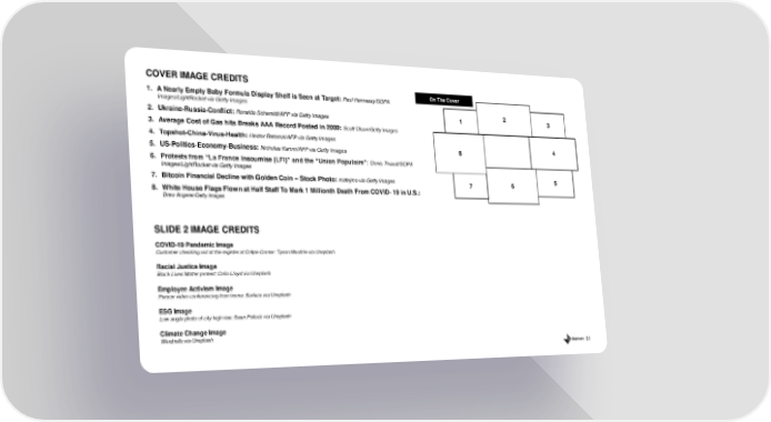 51 1. A Nearly Empty B aby F ormula Display S helf is Seen at Target: Paul Hennessy/SOPA Images/ LightRocket via Getty Images 2. Ukraine - Russia - Conflict: Ronaldo Schemidt /AFP via Getty Images 3. Average Cost of Gas hits Breaks AAA Record Posted in 2000: Scott Olson/Getty Images 4. Topshot - China - Virus - Health: Hector Retamal/AFP via Getty Images 5. US - Politics - Economy - Business: Nicholas Kamm /AFP via Getty Images 6. Protests from “La France Insoumise (LFI)” and the “Union Populaire”: Denis Thaust /SOPA Images/ LightRocket via Getty Images 7. Bitcoin Financial Decline with Golden Coin – Stock Photo: matejmo via Getty Images 8. White House Flags Flown at Half Staff To Mark 1 Millionth Death From COVID - 19 in U.S.: Drew Angerer /Getty Images COVID - 19 Pandemic Image Customer checking out at the register at Crêpe Corner: Tyson Moultrie via Unsplash Racial Justice Image Black Lives Matter protest: Colin Lloyd via Unsplash Employee Activism Image Person video conferencing from home: Surface via Unsplash ESG Image Low angle photo of city high rise : Sean Pollock via Unsplash Climate Change Image Windmills via Unsplash SLIDE 2 IMAGE CREDITS COVER IMAGE CREDITS 1 2 3 4 5 6 7 8 On The Cover