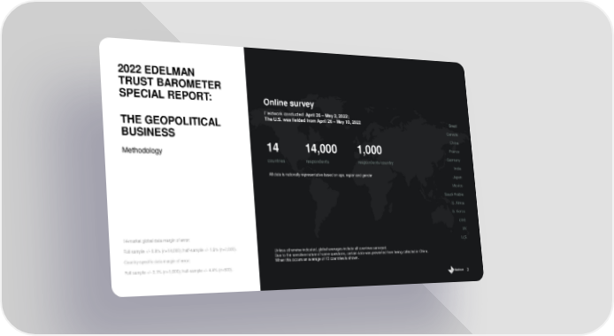 3 Unless otherwise indicated, global averages include all countries surveyed. Due to the sensitive nature of some questions, certain data was prevented from being collected in China. When this occurs an average of 13 countries is shown. 14 - market global data margin of error: Full sample +/ - 0.8% (n=14,000); half - sample +/ - 1.2% (n=7,000). Country - specific data margin of error: Full sample +/ - 3.1% (n=1,000); half - sample +/ - 4.4% (n=500). Methodology 2022 EDELMAN TRUST BAROMETER SPECIAL REPORT: THE GEOPOLITICAL BUSINESS Online survey Fieldwork conducted: April 26 – May 2, 2022; The U.S. was fielded from April 26 – May 10, 2022 14 14,000 1,000 countries respondents respondents/country Brazil Canada China France Germany India Japan Mexico Saudi Arabia S. Africa S. Korea UAE UK U.S. All data is nationally representative based on age, region and gender