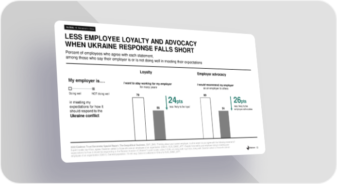 13 My employer is.... LESS EMPLOYEE LOYALTY AND ADVOCACY WHEN UKRAINE RESPONSE FALLS SHORT 2022 Edelman Trust Barometer Special Report: The Geopolitical Business. EMP_ENG. Thinking about your current employer, to what extent do you agree with the following statements? 9 - point scale; top 4 box, agree. Question asked to those who are an employee of an organization (Q43/1). RUS_SANC_APP. Overall, how well is your employer doing in meeting your expectations for how it should be responding to the Russian invasion of Ukraine? 5 - point scale; codes 1 - 3,99, not doing well; to p 2 box, doing well. Question asked to those who are an employee of an organization (Q43/1). General population, 13 - mkt avg. Data not collected in China for RUS_SANC_APP. Percent of employees who agree with each statement, among those who say their employer is or is not doing well in meeting their expectations Doing well NOT doing well 79 80 55 54 Loyalty Employer advocacy in meeting my expectations for how it should respond to the Ukraine conflict 24 pts less likely to be loyal I want to stay working for my employer for many years I would recommend my employer as an employer to others 26 pts less likely to be employer advocates GLOBAL 13 Not asked in China