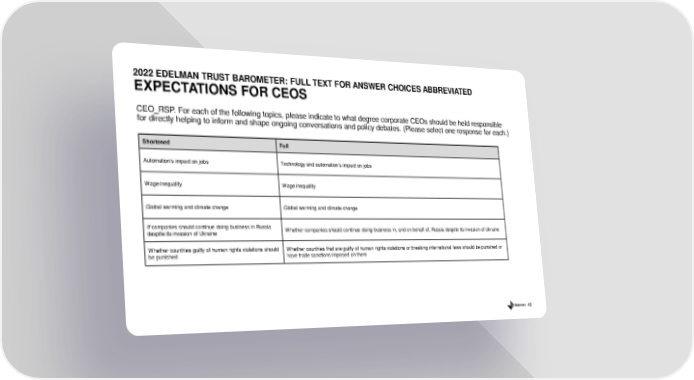 49 2022 EDELMAN TRUST BAROMETER: FULL TEXT FOR ANSWER CHOICES ABBREVIATED EXPECTATIONS FOR CEOS Shortened Full Automation’s impact on jobs Technology and automation’s impact on jobs Wage inequality Wage inequality Global warming and climate change Global warming and climate change If companies should continue doing business in Russia despite its invasion of Ukraine Whether companies should continue doing business in, and on behalf of, Russia despite its invasion of Ukraine Whether countries guilty of human rights violations should be punished Whether countries that are guilty of human rights violations or breaking international laws should be punished or have trade sanctions imposed on them CEO_RSP . For each of the following topics, please indicate to what degree corporate CEOs should be held responsible for directly helping to inform and shape ongoing conversations and policy debates. (Please select one response for each.)