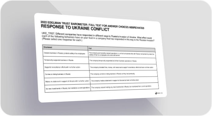 42 2022 EDELMAN TRUST BAROMETER: FULL TEXT FOR ANSWER CHOICES ABBREVIATED RESPONSE TO UKRAINE CONFLICT Shortened Full Ceases business in Russia; protects safety of ex - employees The company permanently ceased operations in, and all cut business ties with Russia; but worked to protect the safety of their ex - employees who were left behind Temporarily suspends business in Russia The company temporarily suspended all of their business operations in Russia Supports humanitarian efforts with no further action The company donated time, money, and resources to support humanitarian efforts but took no further action Carries on doing business in Russia The company carried on doing business in Russia as they had previously Makes no statement in support of Ukraine with no further action The company made a statement in support of Ukraine but took no further action No new investments in Russia, but maintains current operations The company ceased making any new investments in Russia, but maintained their current operations UKE_TRST. Different companies have responded in different ways to Russia’s invasion of Ukraine. What effect would each of the following behaviors have on your trust in a company that has responded in this way to the Russian invasion? (Please select one response for each.)