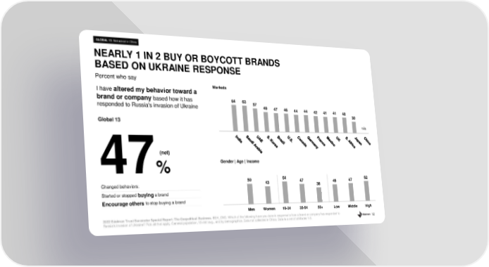 12 Percent who say NEARLY 1 IN 2 BUY OR BOYCOTT BRANDS BASED ON UKRAINE RESPONSE 2022 Edelman Trust Barometer Special Report: The Geopolitical Business. BEH_CNG. Which of the following have you done in response to how a brand or company has responded to Russia's invasion of Ukraine? Pick all that apply. General population, 13 - mkt avg., and by demographics. Data not collected in C hina. Data is a net of attributes 1 - 3. 50 43 54 47 38 45 47 52 Men Women 18-34 35-54 55+ Low Middle High 64 63 57 49 47 46 44 44 42 41 41 40 30 Global 13 47 % Markets Gender | Age | Income I have altered my behavior toward a brand or company based how it has responded to Russia's invasion of Ukraine Changed behaviors: Started or stopped buying a brand Encourage others to stop buying a brand n/a GLOBAL 13 Not asked in China (net)