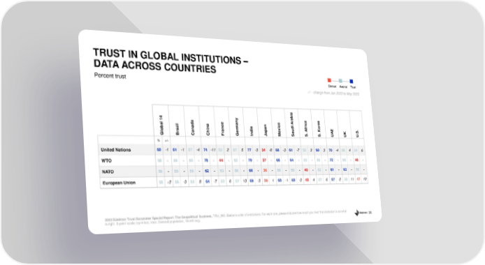 36 2022 Edelman Trust Barometer Special Report: The Geopolitical Business. TRU_INS. Below is a list of institutions. For each one, please indicate how much you trust that institution to do what is right. 9 - point scale; top 4 box, trust. General population, 14 - mkt avg. Percent trust TRUST IN GLOBAL INSTITUTIONS – DATA ACROSS COUNTRIES Global 14 Brazil Canada China France Germany India Japan Mexico Saudi Arabia S. Africa S. Korea UAE UK U.S. % +/ - United Nations 60 - 1 61 - 1 57 - 4 74 - 11 52 2 57 5 77 - 3 34 - 8 68 - 3 61 - 7 52 3 60 3 70 - 4 58 4 54 6 WTO 58 - 58 - 50 - 78 - 44 - 52 - 79 - 37 - 66 - 64 - 53 - 55 - 72 - 55 - 48 - NATO 56 - 55 - 59 - 62 - 53 - 56 - 68 - 38 - 58 - 58 - 40 - 52 - 61 - 63 - 56 - European Union 55 +2 56 - 3 53 8 64 - 7 52 6 57 13 69 - 3 39 1 60 - 1 60 - 3 43 4 57 6 67 - 2 50 11 47 10 Distrust Neutral Trust +/ - : change from Jan 2022 to May 2022